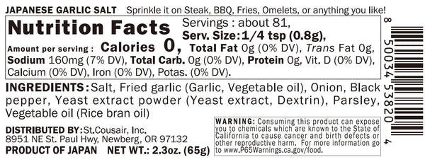 INGREDIENTS: Salt, Fried garlic (Garlic, Vegetable oil), Onion, Black pepper, Yeast extract powder (Yeast extract, Dextrin), Parsley, Vegetable oil (Rice bran oil)
