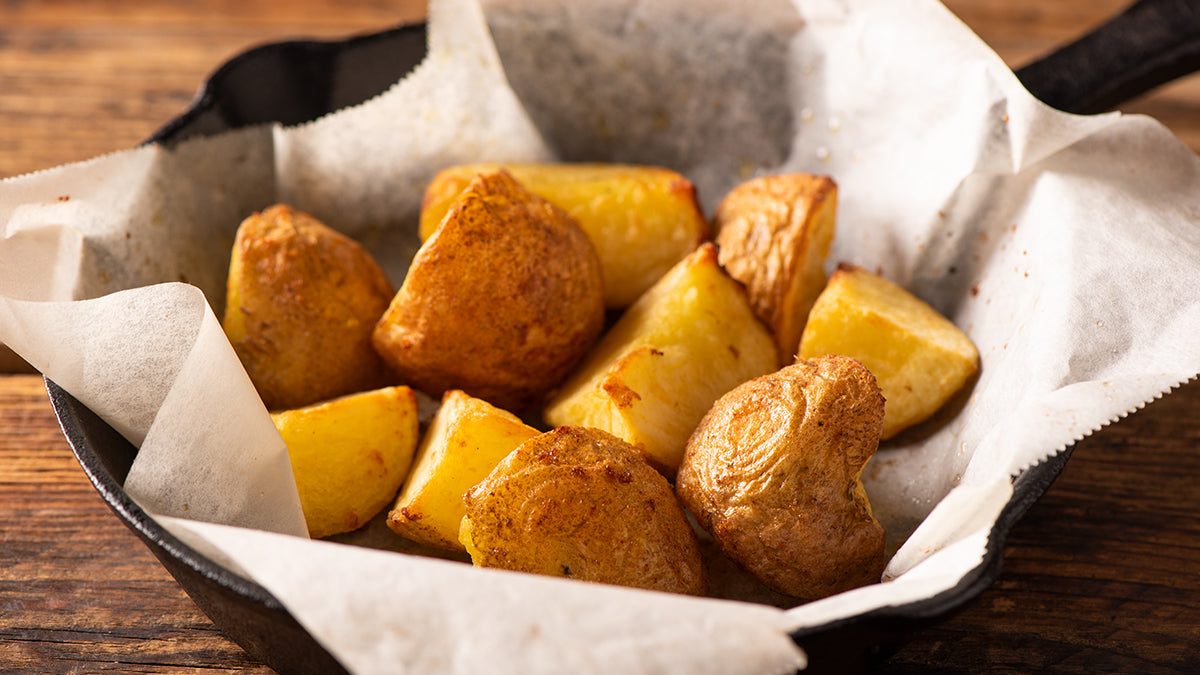 Wrap the washed potatoes in wet kitchen paper, wrap in plastic wrap and cook on 1,000W for 1 minute. Cut the potatoes into bite-sized pieces. In a bowl, mix olive oil and melted butter. Then, mix in potatoes. Open Vegetable Umami Dashi packet and sprinkle its contents over the potatoes. Bake in a preheated oven at 230°C for 10 minutes.