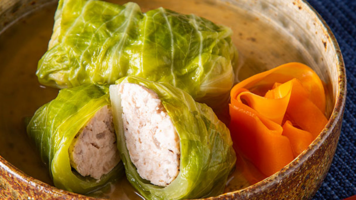 Ginger-scented Cabbage Rolls with Vegetable Umami Dashi Dressing