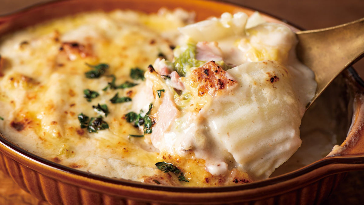 Cut Chinese cabbage and bacon into bite-size pieces. Mix flour and the contents of one packet of Vegetable Umami Dashi in a bowl and add milk in two parts. Melt butter in a frying pan and saute cabbage and bacon over medium heat. When Chinese cabbage is cooked, add flour and dashi mixture and mix until thickened. Place combined contents in a heat-safe dish, sprinkle with cheese as desired and bake in a toaster or oven.