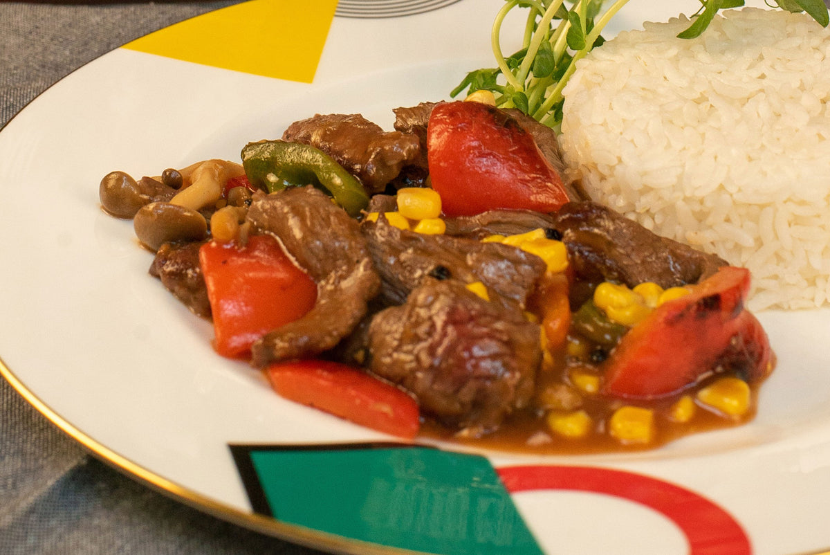 - Slice the beef across the grain into 1/2” bite pieces, then marinate in a large bowl with the olive oil, crushed peppercorns and cornstarch for 15 minutes.