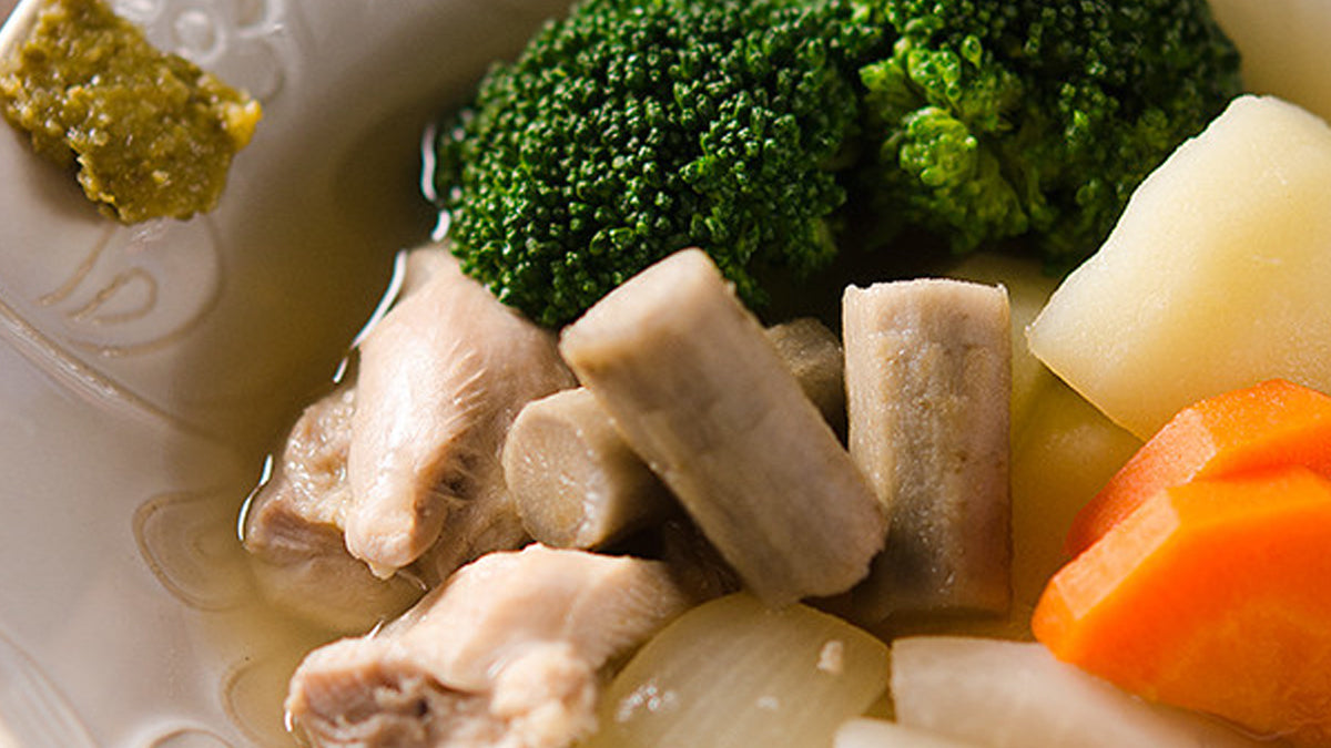 Cut carrots into 1cm half-moon slices, burdock root into 3cm widths, onions into skewers, chicken and broccoli into bite-size pieces. Cut daikon radish into 1 cm wide chunks and cut potatoes in half. In a pot, make Vegetable Umami Dashi broth according to package instructions. Include the above ingredients while preparing the broth. Add salt to taste. Serve in a bowl with a dash of Yuzu Kosho.