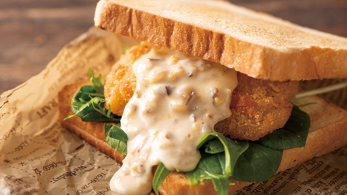- 2のうち1枚に魚のソテーとたっぷりのいぶりがっこタルタルをのせたら、もう1枚で挟み、サンドイッチにする。