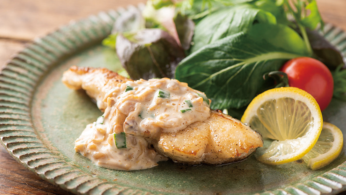 - ムニエルにした白身魚を皿に盛り付け、①をかける。お好みの野菜やレモンを添える。