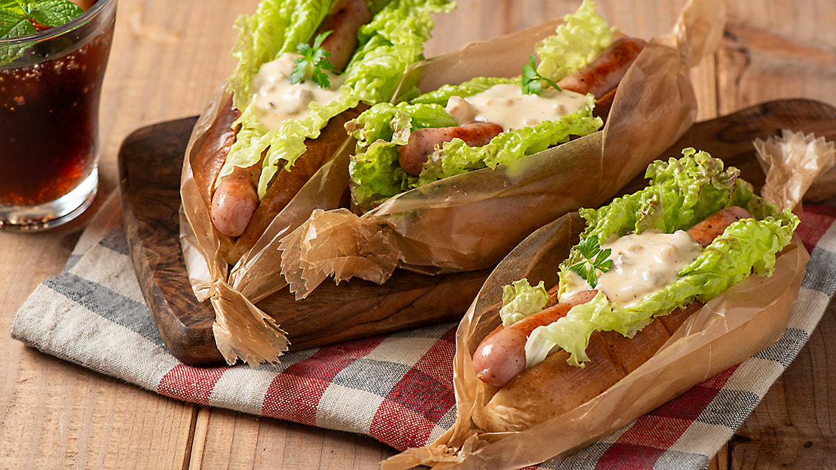 - ドッグパンに①と②を挟み、いぶりがっこタルタルをのせる。