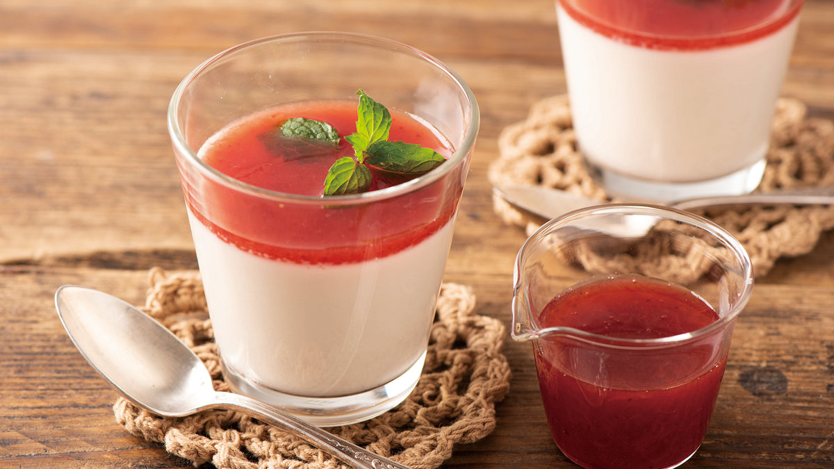 - いちごミルクの素(分量外)、ミントなどをトッピングする。