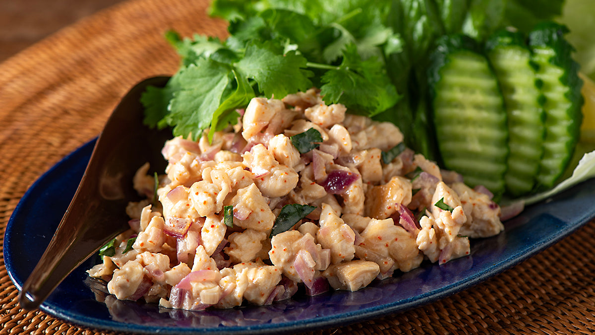 ラープガイとはお肉や魚などを使ったラオスやタイのサラダ。荒く挽いた炒り米を使うところを香ばしいいぶりがっこタルタルで。辛さが苦手な方は一味なしでも◎