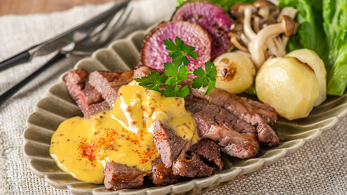 フランス料理の伝統的なステーキソースをいぶりがっこタルタルをベースに和風にアレンジ。