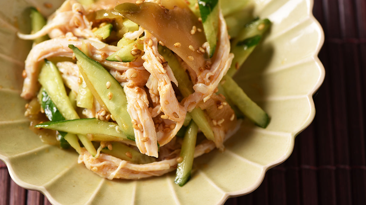 - きゅうりは細切りに、サラダチキンは手で食べやすいようにほぐしておく
