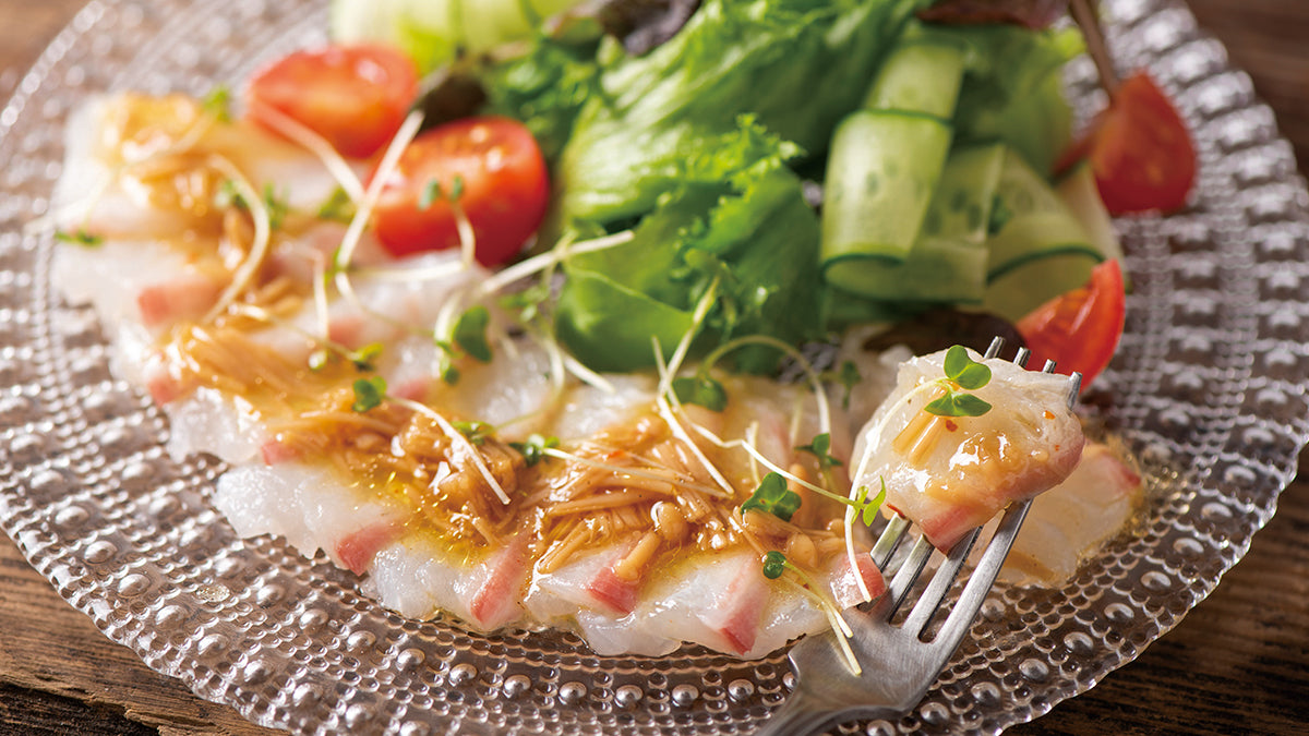 - お好みの野菜やお刺身を皿に盛り付け、ソースをかける。
