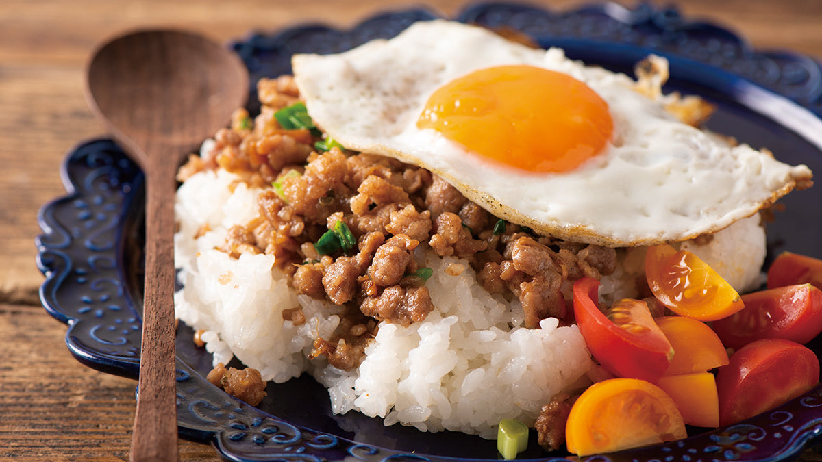 - 皿にご飯を盛り、出来上がったガパオをのせる。目玉焼きとお好みで野菜を添える。