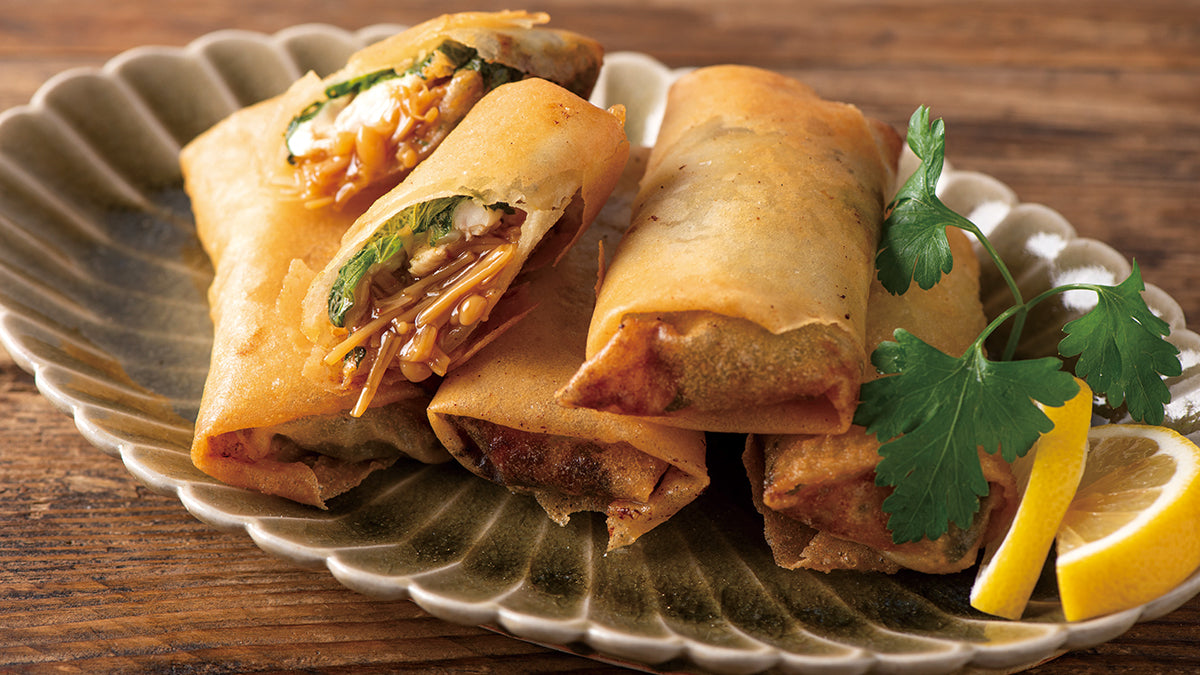いぶりいぶりがっこタルタルを付けて召し上がっていただく春巻きです