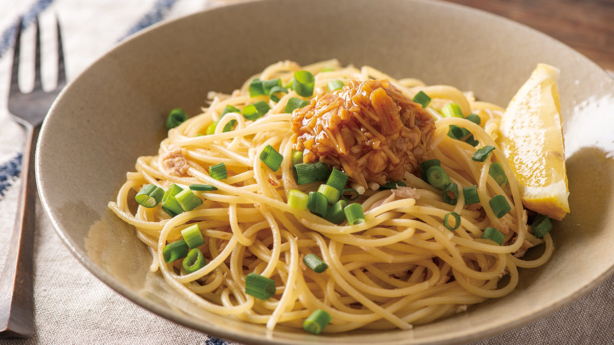 - 皿に3を盛り付けたら、七味なめ茸をトッピングして小ネギを散らす。