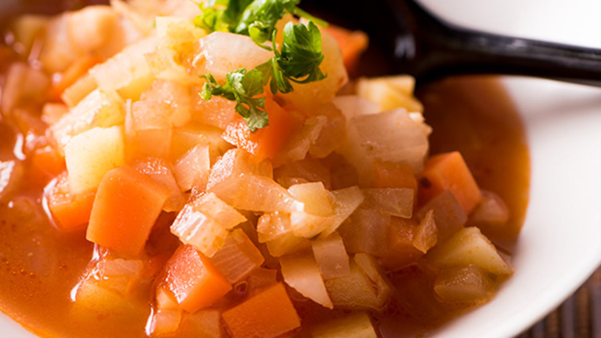 Cut vegetables and bacon into 1cm cubes. Heat oil in a pan and fry the bacon. When all the oil has been cooked off, add water, tomato juice and vegetable broth and bring to a simmer. When vegetables are tender, place in a bowl and garnish with Italian parsley.